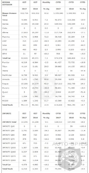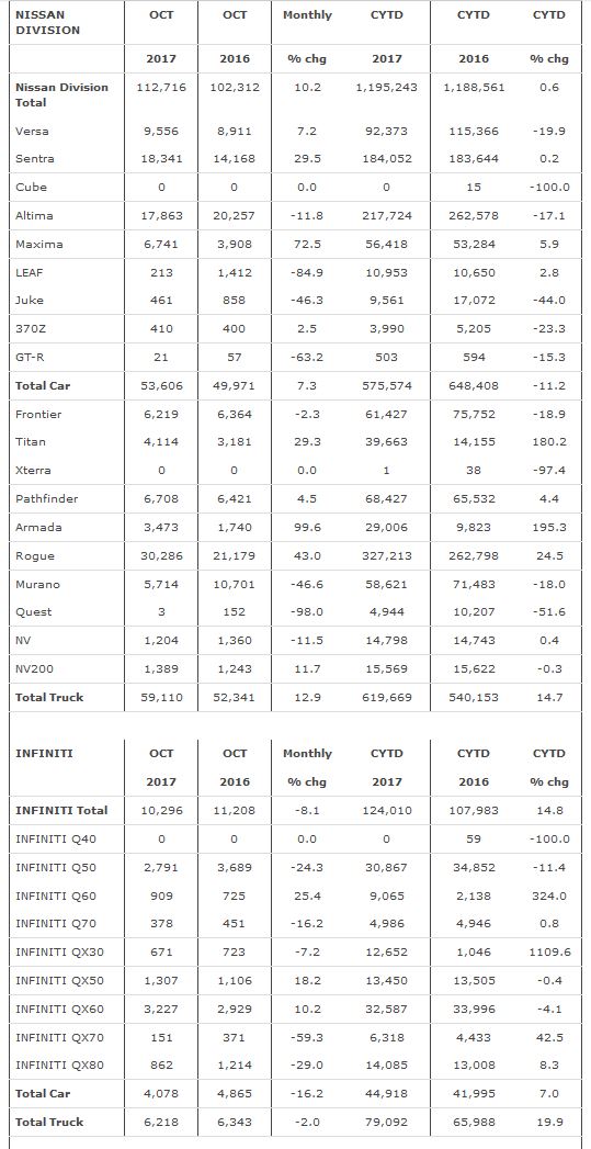 Nissan Group announced total U.S. sales for October 2017 of 123,012 units, an increase of 8.4 percent over the previous year. This marks an October record. Nissan highlights: