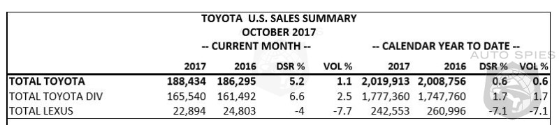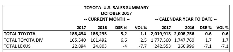 Toyota Motor North America Inc., today reported October 2017 sales of 188,434 units. With one less selling day in October 2017 compared to October 2016, sales were up 1.1 percent on volume and up 5.2 percent on a daily selling rate (DSR) basis.