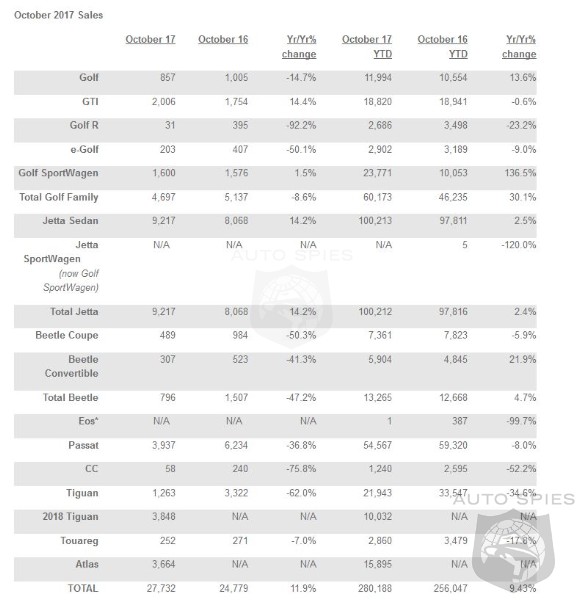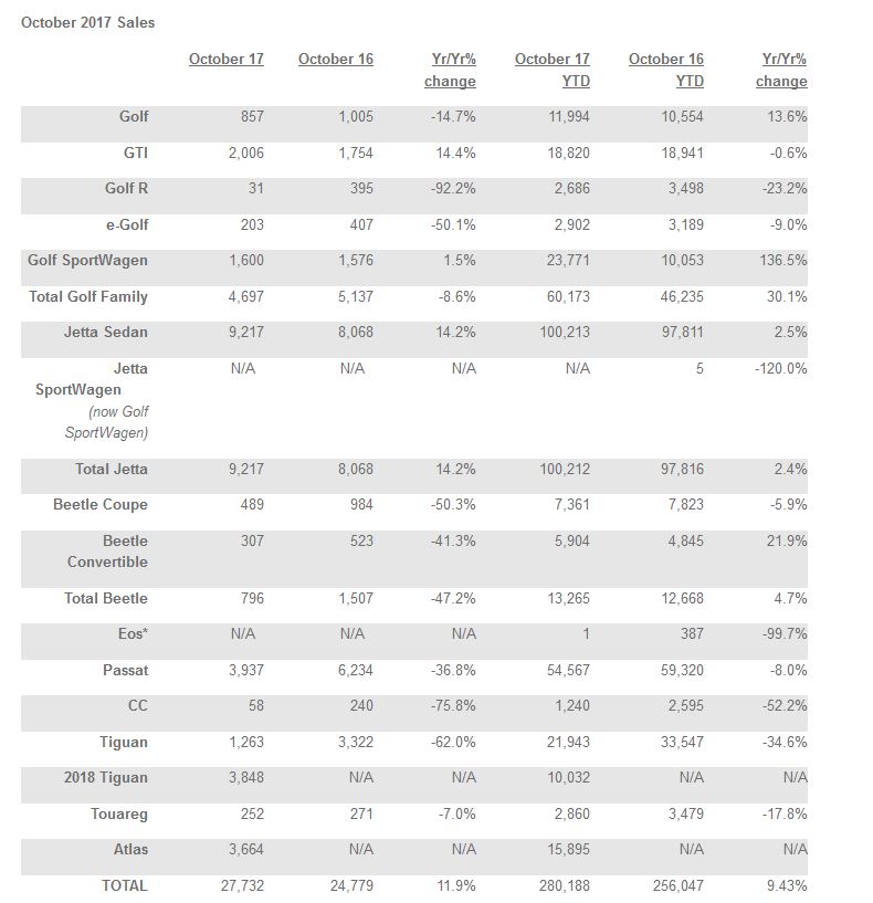Volkswagen of America, Inc. (VWoA) today reported sales of 27,732 units delivered in October 2017, an 11.9 percent increase over October 2016. With 280,188 units delivered year-to-date in 2017, the company is reporting an increase of 9.4 percent in year-over-year sales.