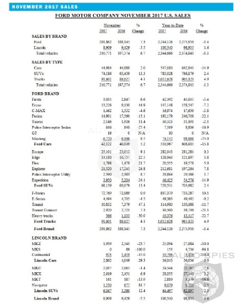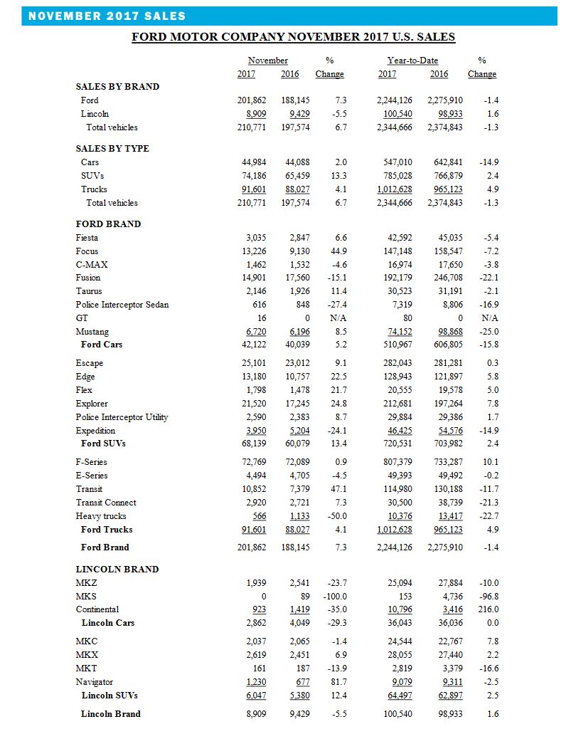 Ford Motor Company’s U.S. sales totaled 210,771 vehicles for November, a 6.7 percent gain over 2016