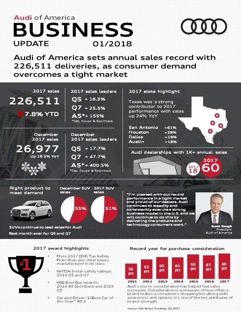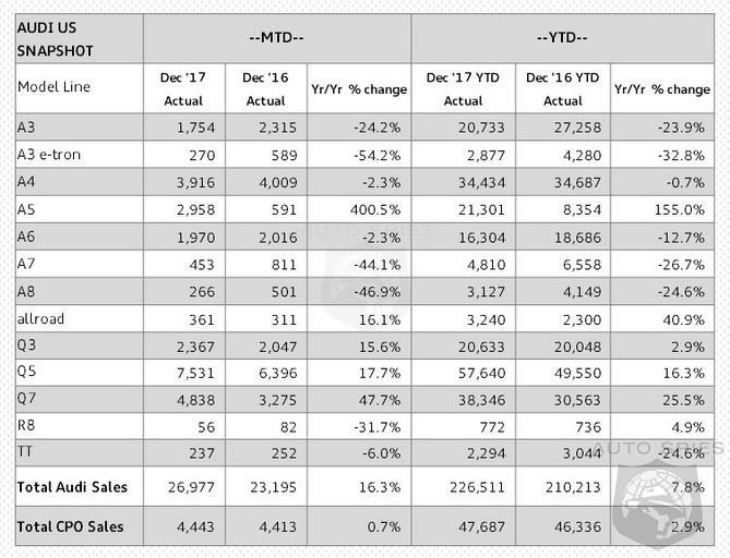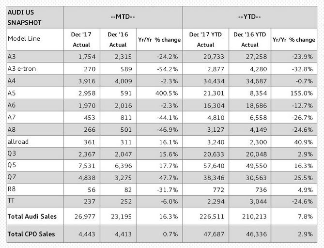 Audi End 2017 with a bang and a 16.3% increase in sales. This rounded out a 7.8% Increase for 2017 far outpacing the segment. Overall volume was 226,511 vehicles.