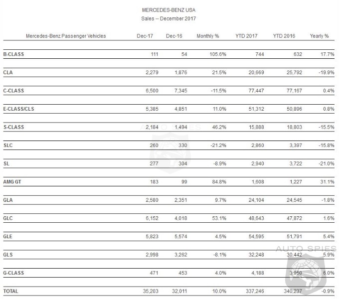 Mercedes-Benz USA today reported highest monthly sales in its history with a best-ever December total of 35,203 units, an increase of 10.0% from the 32,011 vehicles sold during the same period last year. Mercedes-Benz Vans reported best-ever December sales with 4,047 units (up 4.8%) and smart reported 166 units, bringing MBUSA to a record December with 39,416 vehicles (up 6.4%). On a year-to-date basis, Mercedes-Benz retails totaled 337,246 units.