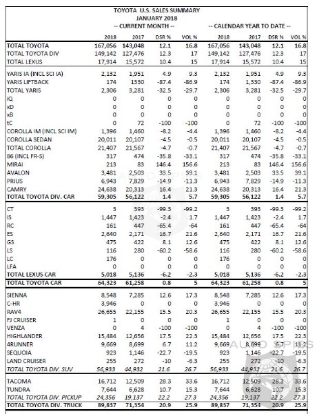 Toyota Motor North America (TMNA) today reported January 2018 sales of 167,056 vehicles, an increase of 16.8 percent from January 2017 on a volume basis. With one more selling day in January 2018 compared to January 2017, sales were up 12.1 percent on a daily selling rate (DSR) basis.