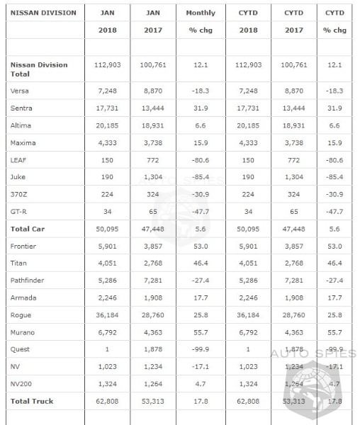 Nissan Group today announced total U.S. sales for January 2018 of 123,538 units, an increase of 10% over the previous year. This marks a January record. Nissan highlights: