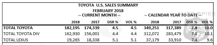 Toyota Motor North America (TMNA) today reported February 2018 sales of 182,195 vehicles, an increase of 4.5 percent from February 2017 on a volume basis. With the same amount of selling days in February 2018 compared to February 2017, sales were up 4.5 percent on a daily selling rate (DSR) basis.