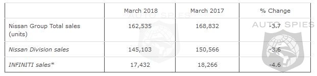 Nissan Group today announced total U.S. sales for March 2018 of 162,535 units, a decrease of 4% compared to the previous year. Nissan highlights: