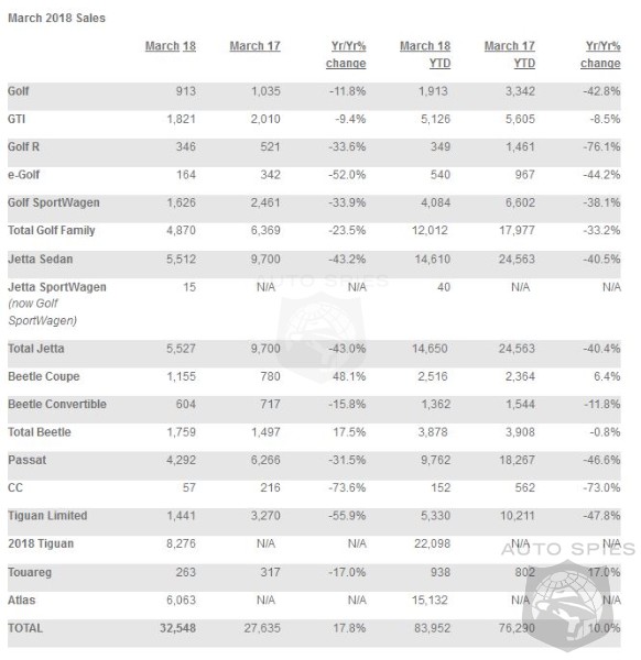 Volkswagen of America, Inc. (VWoA) today reported sales of 32,548 units delivered in March 2018, an increase of 17.8 percent over March 2017. With 83,952 units delivered year-to-date in 2018, the company is reporting a 10 percent increase in year-over-year sales. March 2018 was the best month to date for the all-new 2018 Tiguan, with 8,276 units sold. The Chattanooga-built Atlas totaled 6,063 units sold. Overall, first quarter sales reflected the impact of Volkswagen’s move to offer a more family-friendly lineup, with SUVs accounting for more than 50 percent of total volume for the Volkswagen brand in year-over-year sales. Through the first quarter of 2017, SUVs made up only 14.4 percent of total sales for the brand.