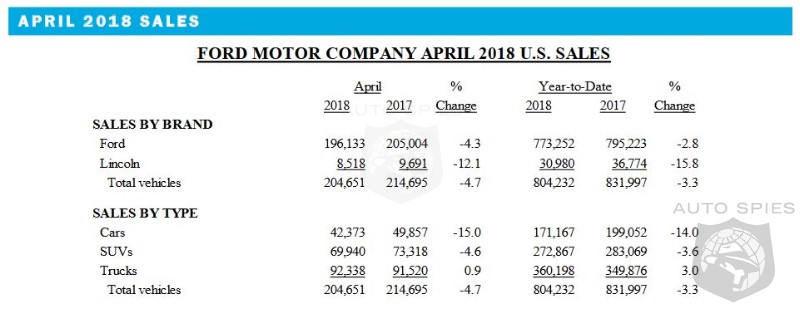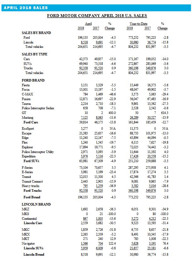 Ford Motor Company U.S. sales for April totaled 204,651 vehicles a 4.7 percent decline