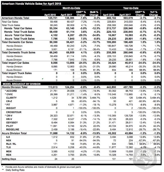 Two fewer selling days and one less weekend in April 2018 vs. a year ago, impacted Honda car & truck sales like the rest of the auto industry. However, the brand’s core models performed strongly while Odyssey and Pilot were standouts for the month.