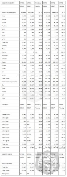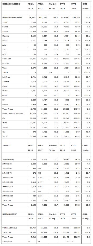 Nissan Group today announced total U.S. sales for April 2018 of 87,764 units, a decrease of 28% compared to the previous year. Nissan highlights: