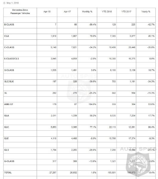 Separately, Mercedes-Benz Certified Pre-Owned (MBCPO) models recorded sales of 9,294 vehicles in April, compared to 9,874 vehicles sold during the same month last year. On a year-to-date basis, MBCPO sold 39,035 vehicles, a decrease of 3.3% over 2017 (40,352).