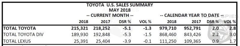 Toyota Motor North America (TMNA) today reported May 2018 sales of 215,321 vehicles, a decrease of 1.3 percent from May 2017 on a volume basis. With one more selling day in May 2018 compared to May 2017, sales were down 5.1 percent on a daily selling rate (DSR) basis.