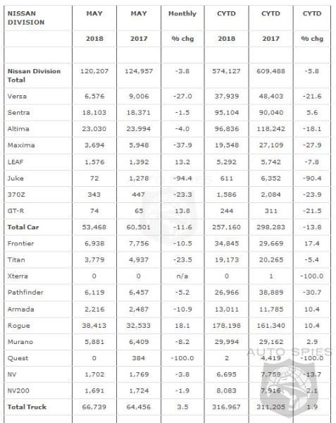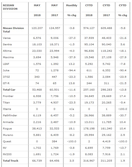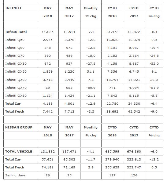Nissan Group today announced total U.S. sales for May 2018 of 131,832 units, a decrease of 4 percent compared to the previous year. Nissan highlights: