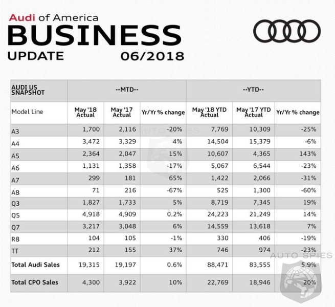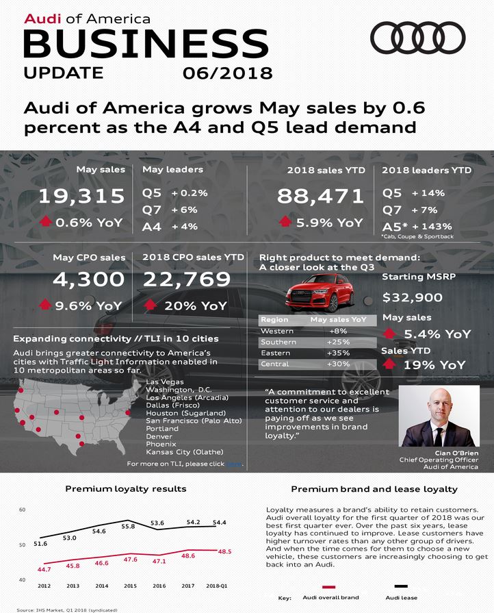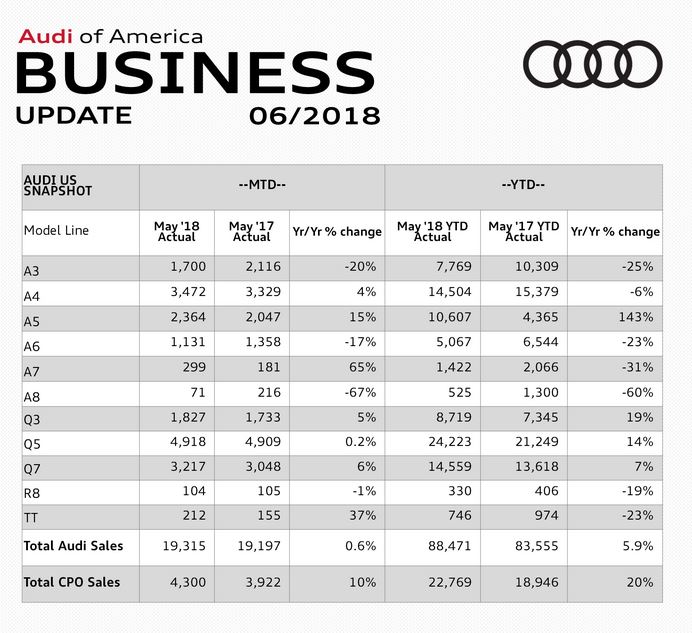 Audi of America grows May sales by 0.6 percent as the A4 and Q5 lead demand.