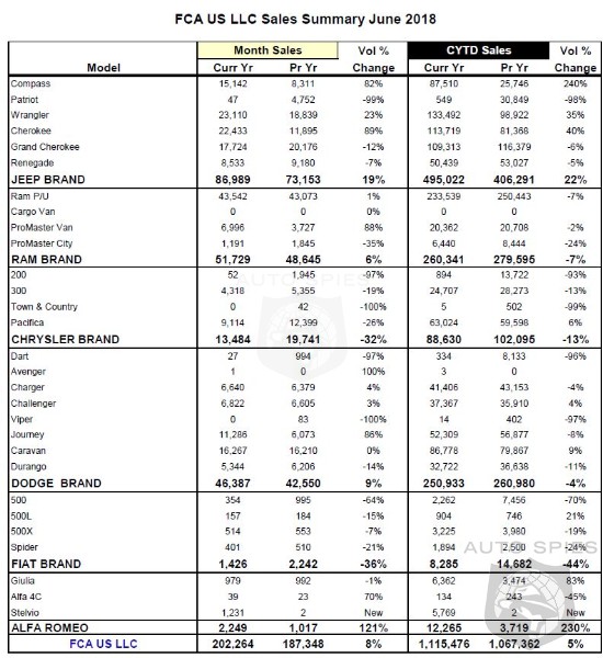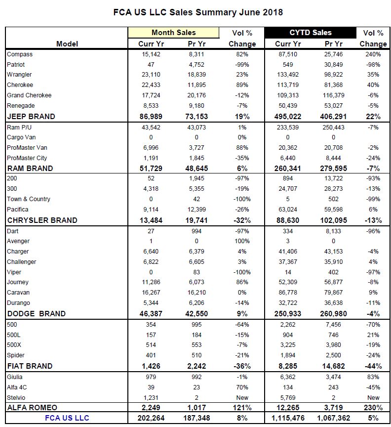 FCA US LLC today reported June 2018 sales of 202,264 vehicles, an 8 percent increase compared with sales in June 2017 of 187,348 vehicles.