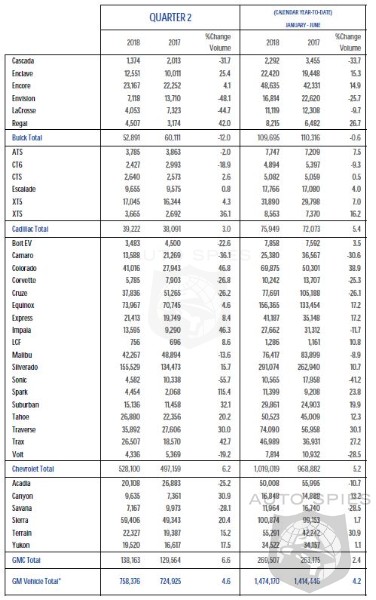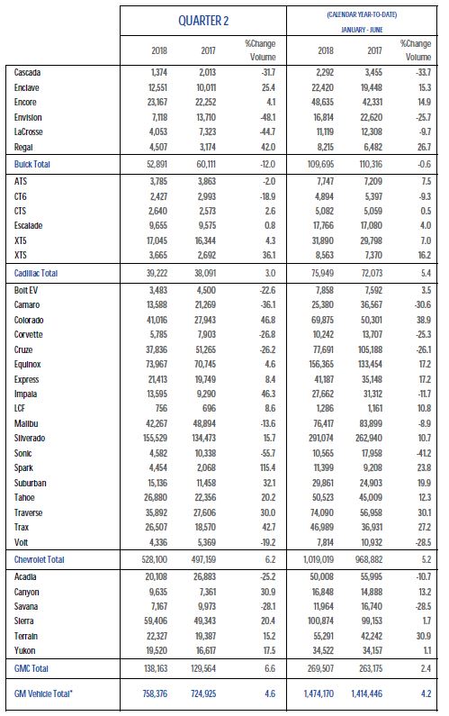 Very strong truck sales and a wave of all-new crossovers helped General Motors Co. (NYSE: GM) deliver more than 758,000 vehicles in the United States in the second quarter of 2018. Second quarter sales at Chevrolet and GMC far outpaced the industry on a year-over-year basis, growing 6 percent and 7 percent, respectively, while industry sales are estimated to be up 1 to 2 percent. Cadillac sales were up 3 percent and GM’s overall sales were up 5 percent for an estimated market share of 16.6 percent, up 0.5 percentage points.