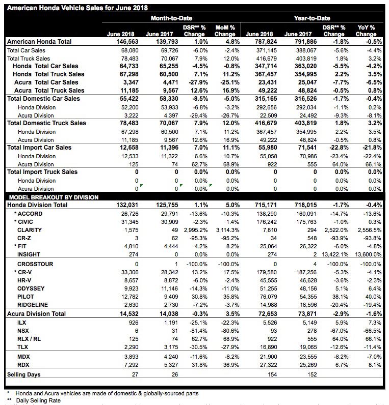 - Honda brand nets new June total vehicle and trucks sales records, rising 5% overall as trucks gain 11.2%