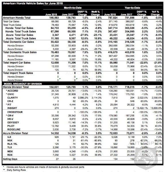- Acura trucks set new June record, up 17% on record RDX and strong MDX sales; total Acura brand up 3.5%