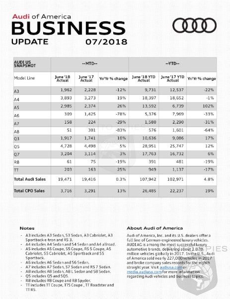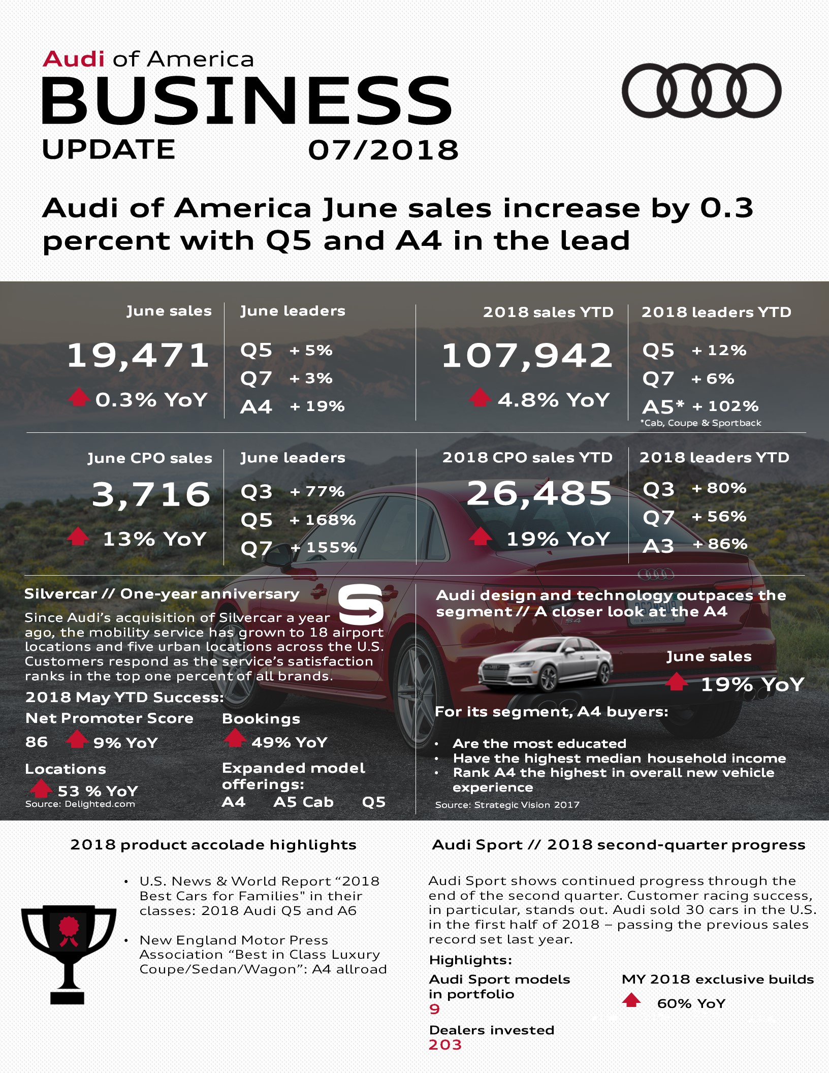Audi of America June sales increase by 0.3% with Q5 and A4 in the lead.