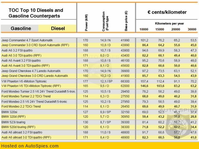 German auto touring club ADAC (Allgemeiner Deutscher Automobil-Club e.V.) has published its annual total cost of ownership (TCO) comparison of diesel and gasoline versions of vehicles currently on the German market.