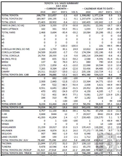 July 2018 Highlights: - Toyota division posted its best-ever month for light truck sales