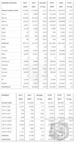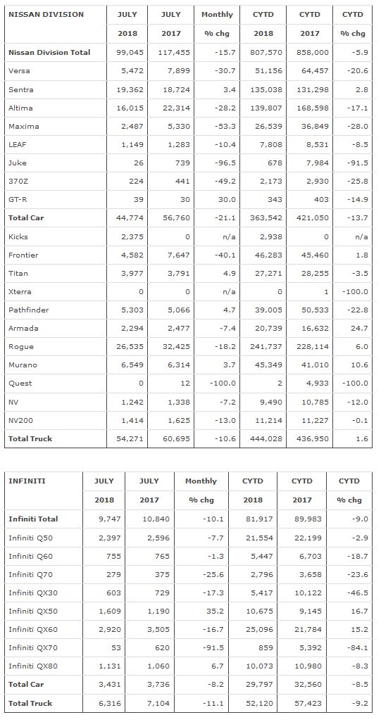Nissan Group today announced total U.S. sales for July 2018 of 108,792 units, a decrease of 15 percent compared to the previous year. Nissan highlights: