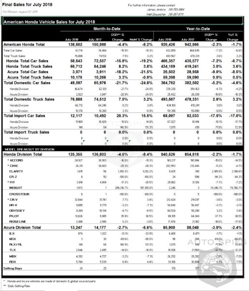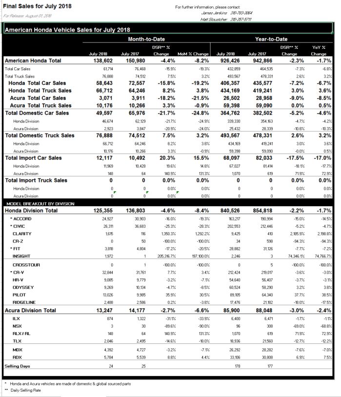 While one less sales weekend than the same period in 2017 led in part to a dip in sales, customers showed a preference for the brand's light trucks including the refreshed-for-2019 Pilot and HR-V, and hot-selling CR-V.