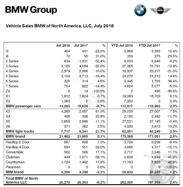 Sales of BMW Group vehicles (BMW and MINI brands combined) in the U.S. decreased 0.3 percent in July 2018 for a total of 26,278 vehicles, compared with 26,363 vehicles sold in the same month a year ago. Year-to-date BMW Group sales in the U.S. are up 2.4 percent from the first seven months of 2017.