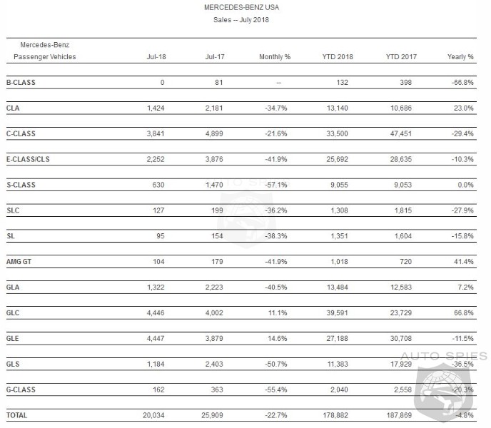 -Mercedes-Benz USA (MBUSA) today reported July sales of 20,034 Mercedes-Benz models, a decrease of 22.7% from July 2017. Mercedes-Benz Vans reported July sales of 2,921 units (up 5.9%) and smart reported 103 units, bringing MBUSA to a grand total of 23,058 vehicles for the month. On a year-to-date basis, sales of Mercedes-Benz vehicles totaled 178,882, with an additional 19,831 units for Vans and 753 vehicles for smart, bringing the sales volume to 199,466, a decrease of 4.4% from last year. “July sales were impacted by a number of factors, resulting in a temporary dealer inventory shortfall relating to our changeover to model year 2019,” said Dietmar Exler, president and CEO of MBUSA. “We also experienced a mainframe outage which affected our dealers’ ability to conduct business during the busiest week of the month. The IT recovery is nearing completion, and we are working closely with our customers and dealers to help alleviate any inconvenience resulting from the model year 2019 delays. While we expect to replenish our inventory levels in the fall, these developments will likely have a negative impact on sales in the coming months.”