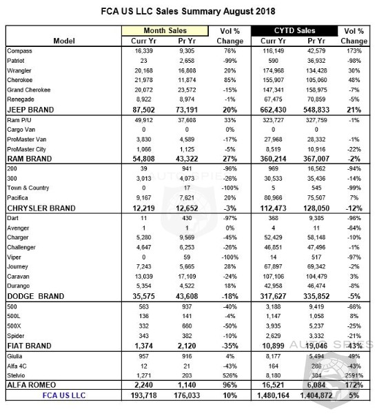 FCA US LLC today reported sales of 193,718 vehicles, a 10 percent increase compared with sales in August 2017 of 176,033. Overall, FCA US retail sales rose 17 percent to 164,727 vehicles. Fleet accounted for 15 percent of total sales.