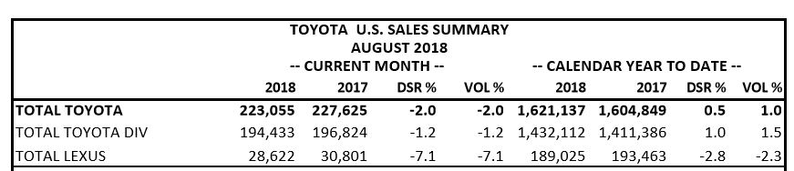 Toyota Motor North America (TMNA) today reported August 2018 sales of 223,055 units. With the same number of selling days in August 2018 compared to August 2017, sales were down 2.0 percent on a daily selling rate (DSR) and volume basis.