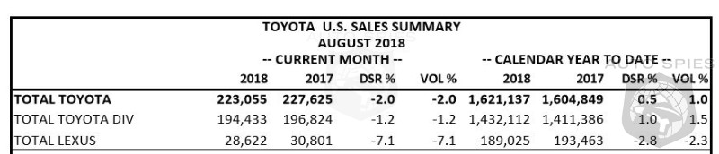 Toyota division posted August 2018 sales of 194,433 units, down 1.2 percent on a DSR and volume basis.