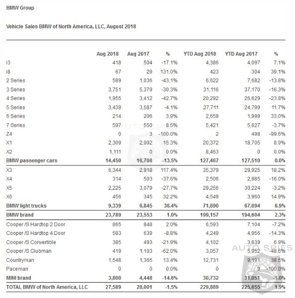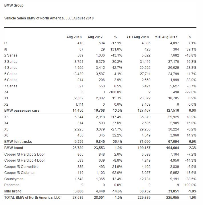 Sales of BMW Group vehicles (BMW and MINI brands combined) in the U.S. decreased 1.5 percent in August 2018 for a total of 27,589 vehicles, compared with 28,001 vehicles sold in the same month a year ago. Year-to-date BMW Group sales in the U.S. are up 1.9 percent from the first eight months of 2017.
