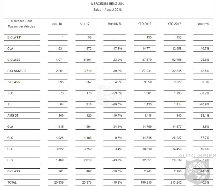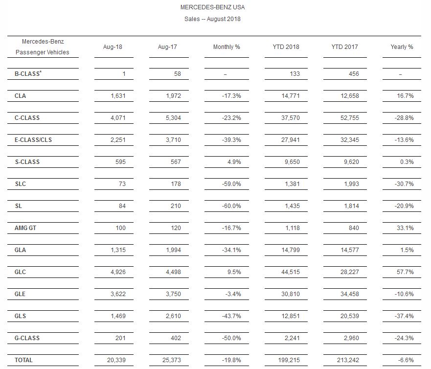 Mercedes-Benz USA (MBUSA) today reported August sales of 20,339 Mercedes-Benz models, a decrease of 19.8% from August 2017. Mercedes-Benz Vans reported best-ever August sales of 3,745 units (up 4.6%) and smart reported 108 units, bringing MBUSA to a grand total of 24,192 vehicles for the month. On a year-to-date basis, sales of Mercedes-Benz vehicles totaled 199,215, with an additional 23,575 units for Vans and 861 vehicles for smart, bringing the sales volume to 223,651, a decrease of 5.9% from last year. “While customer demand remains high, our inventory levels are impacted by delayed availability of many of our 2019 models,” said Dietmar Exler, president and CEO of MBUSA. “We are currently replenishing the inventory of our popular 2019 CLA-, GLC-, E- and GLS-Class this month.”
