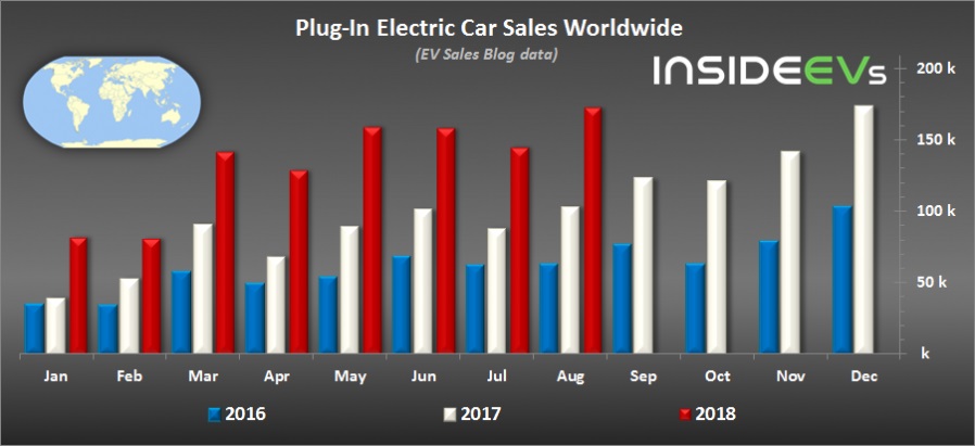 In August, over 172,400 plug-in cars were sold globally, which is 76% more than a year ago and almost a record (174,000 were sold in December 2017). A new record is expected soon. Like maybe next month.