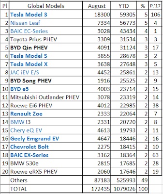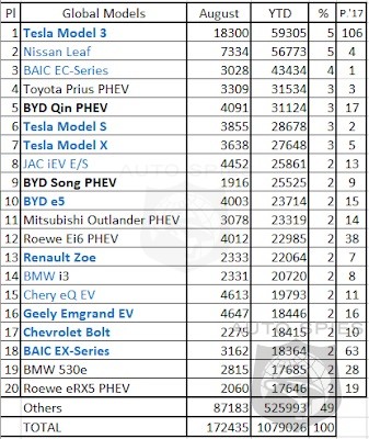 EV Sales Blog just released its global statistics on plug-in electric car sales for the month of August 2018, so we can finally check all of the standings.