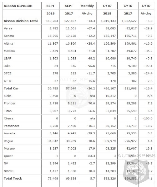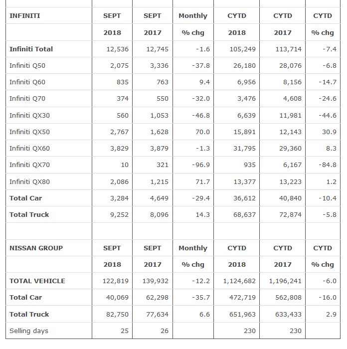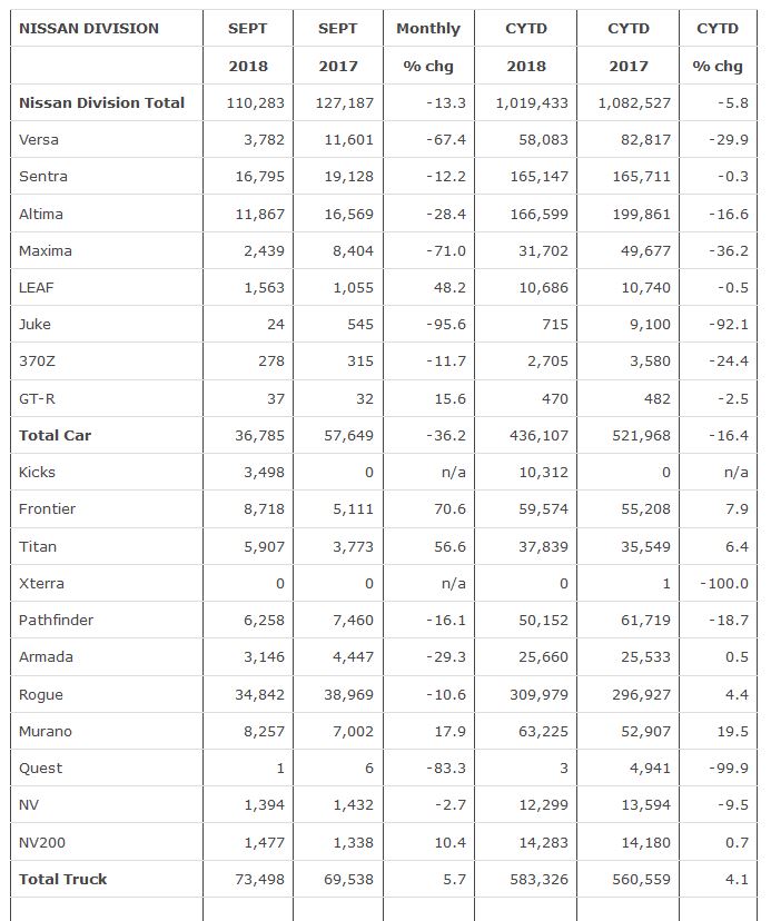 Nissan Group today announced total U.S. sales for September 2018 of 122,819 units, a decrease of 12 percent compared to the previous year. Nissan highlights: