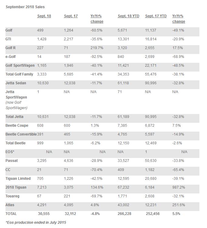 Volkswagen of America, Inc. (VWoA) today reported sales of 30,555 units delivered in September 2018, a decrease of 4.8 percent over September 2017. With 266,228 units year-to-date in 2018, sales have now risen 5.5 percent this year to date. September sales were impacted by delays in the certification process caused by a backlog in meeting new Worldwide Harmonised Light Vehicle Test Procedure standards. Certification delays pushed back the arrival of some model year 2019 vehicles, limiting inventory for the month.