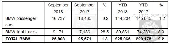 Sales of BMW brand vehicles increased 1.3 percent in September 2018 for a total of 25,908, compared to 25,571 vehicles sold in September 2017. Year-to-date, the BMW brand is up 2.2 percent on sales of 225,065 vehicles compared to 220,175 sold in the first three quarters of 2017.