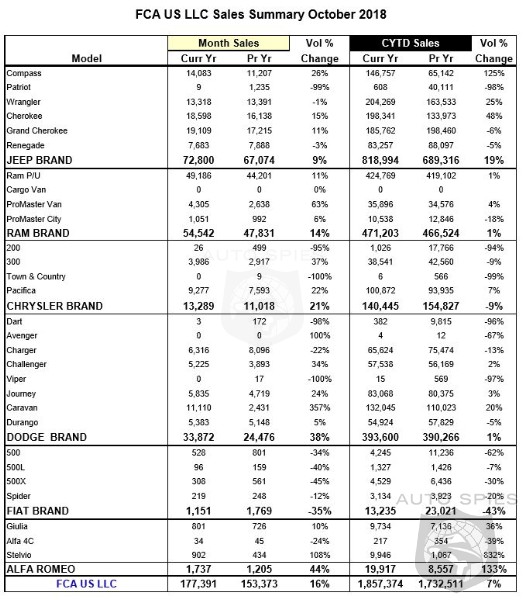 FCA US LLC today reported U.S. sales of 177,391 vehicles in October, a 16 percent increase compared with sales in October 2017 of 153,373 vehicles.