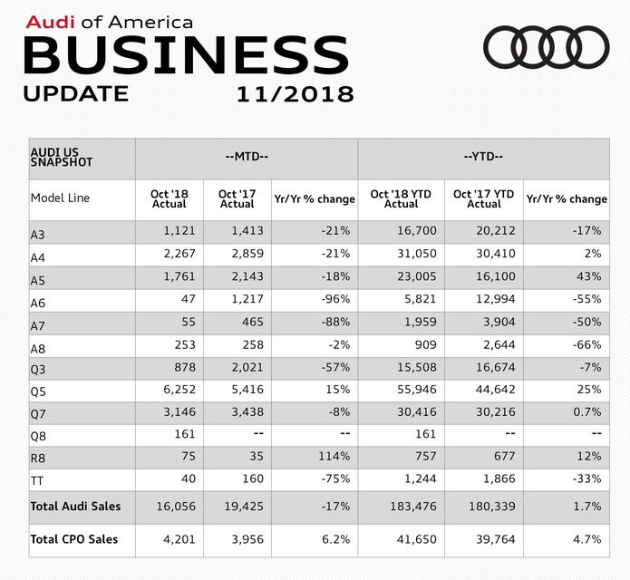 SUV sales were not enough to offset losses across the board at Audi in October as sales plummeted by 17%Below are are figures for the month.
