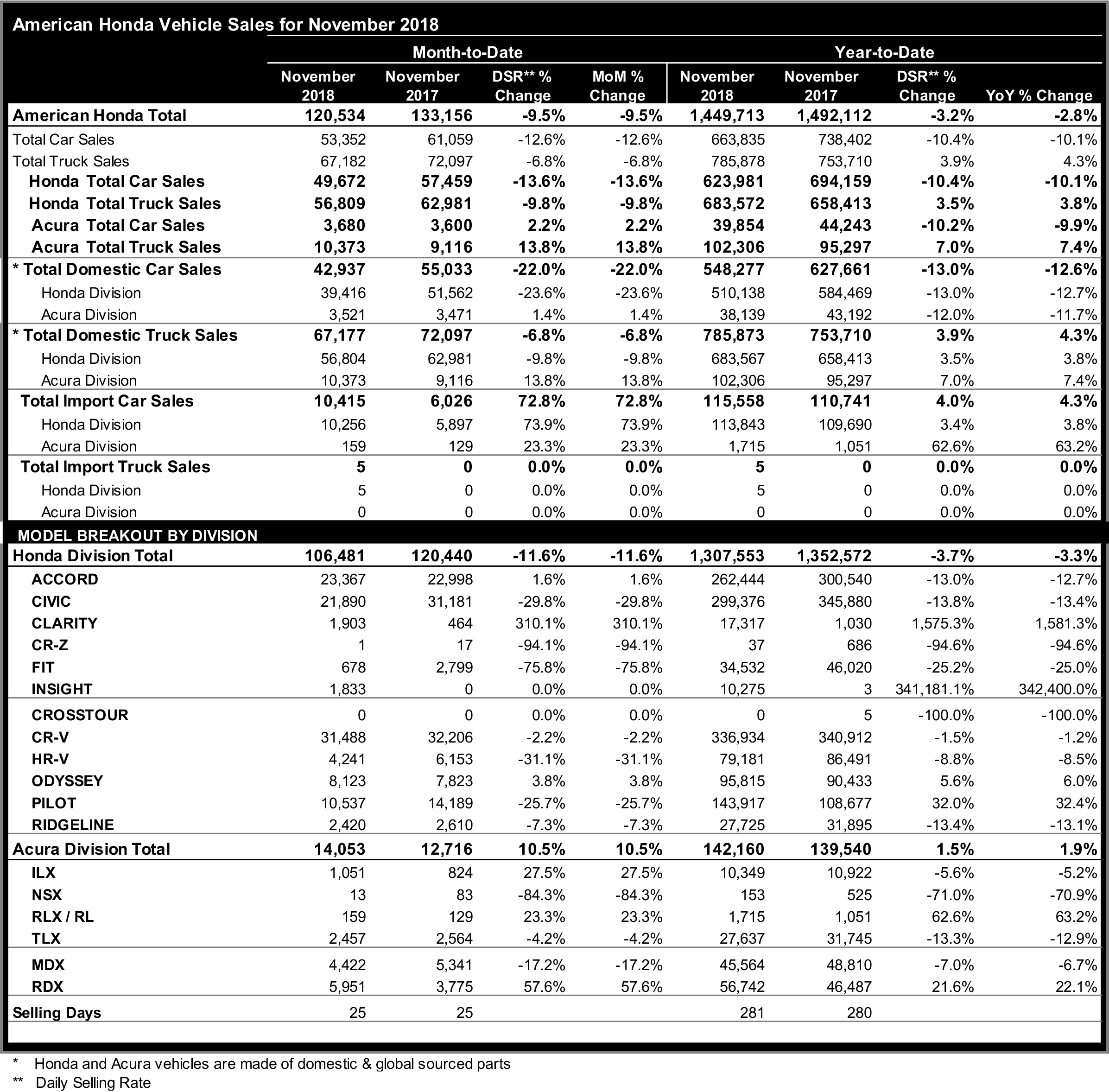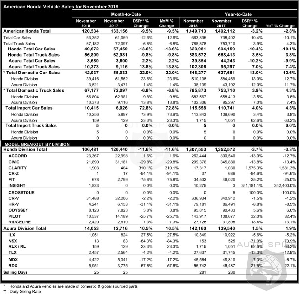 - Acura brand sales gained a total of 10.5% in November, with cars up 2.2% and trucks rising 13.8%.