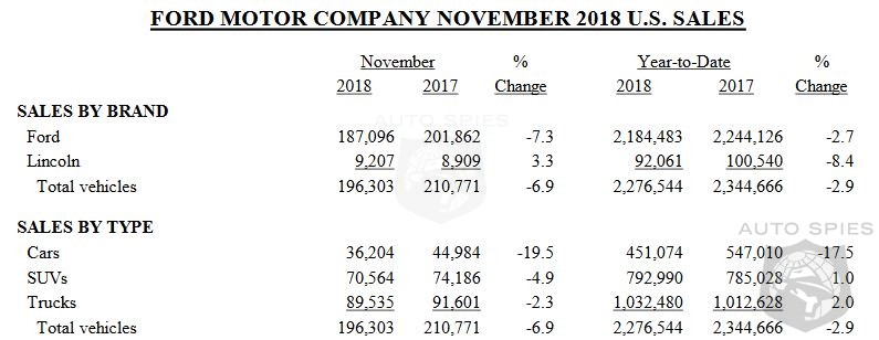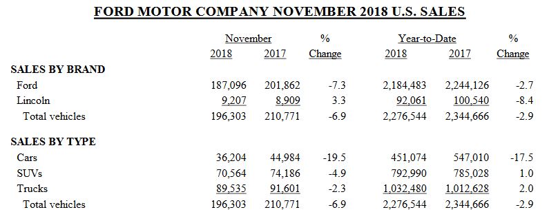 November U.S. sales at Ford Motor Company totaled 196,303 vehicles, representing a 6.9 percent decline