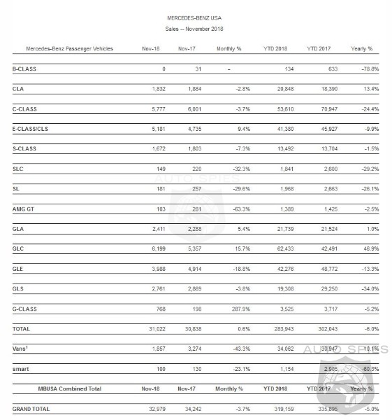 Mercedes-Benz USA (MBUSA) today reported November sales of 31,022 Mercedes-Benz models, an increase of 0.6% from November 2017. Mercedes-Benz Vans reported 1,857 units and smart reported 100 units, bringing MBUSA to a grand total of 32,979 vehicles for the month. On a year-to-date basis, sales of Mercedes-Benz vehicles totaled 283,943, with an additional 34,062 units for Vans and 1,154 vehicles for smart, bringing the total sales volume to 319,159. “Demand for our SUV lineup including the GLA, GLC and new G-Class combined with increases for the E-Class and new CLS fueled results for the month,” said Dietmar Exler, president and CEO of MBUSA. “We anticipate a solid close to the final weeks of 2018.”
