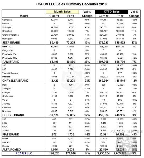 FCA US LLC today reported December U.S. sales of 196,520 vehicles, a 14 percent increase compared with sales of 171,946 vehicles in December 2017.