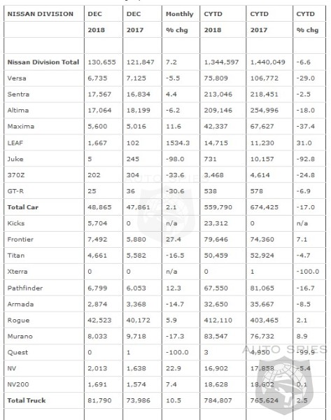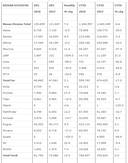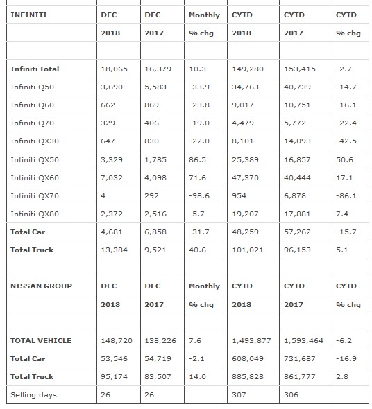 Nissan Group announced total U.S. sales for December 2018 of 148,720 units, an increase of 7.6 percent versus the prior year. Nissan Group also announced total calendar year 2018 U.S. sales of 1,493,877 units, a decrease of 6.2 percent compared to the prior year. Nissan Division December highlights: