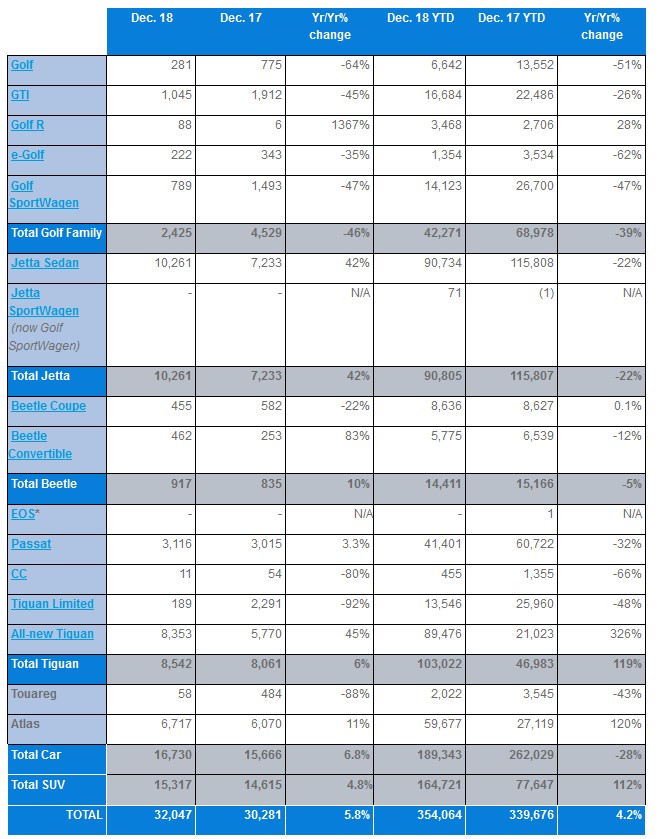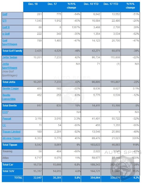 Volkswagen Reports 5.8% Increase In December Sales - Up 4.2% For 2018 - Total sales 354,064