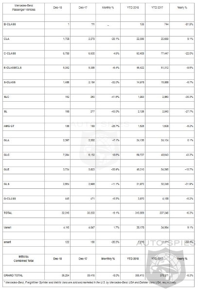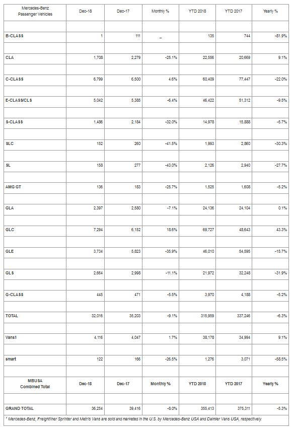 "Despite the delayed availability of some of our most popular models in 2018, we achieved a solid closing of the year thanks to the excellent work of our dealers. We are excited to welcome the next chapter of our product offensive including the all-new A-Class, GLE and Mercedes-AMG GT 4-Door Coupe in the coming months," said Dietmar Exler, president and CEO of MBUSA. "With the youngest and most comprehensive lineup in the luxury segment, we will continue to advance our position in the marketplace."