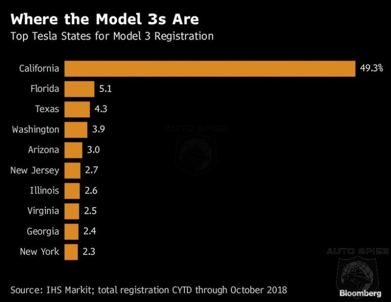 Tesla Inc.’s home state of California accounted for almost half of all Model 3 registrations through the first 10 months of 2018, a sign that the electric-car maker is wildly popular in the Golden State but not yet ubiquitous in other parts of the country. Through October 2018, the last month for which full data is available, California registered 39,606 Model 3 sedans, or 49.3 percent of all Model 3 registrations in the U.S., according to IHS Markit. Florida came in second with 4,064, or 5.1 percent. California is the most populous U.S. state with about 40 million residents, almost twice the size of Florida’s population.