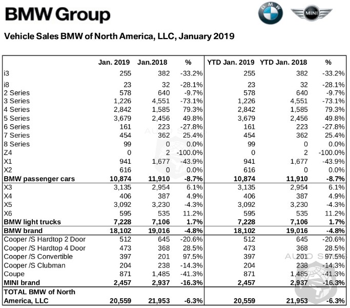 Sales of BMW brand vehicles decreased 4.8 percent in January 2019 for a total of 18,102 compared to 19,016 vehicles sold in January 2018. Top performers for the month included the BMW X3 and BMW X5 Sports Activity Vehicles and the BMW 5 Series sedan.